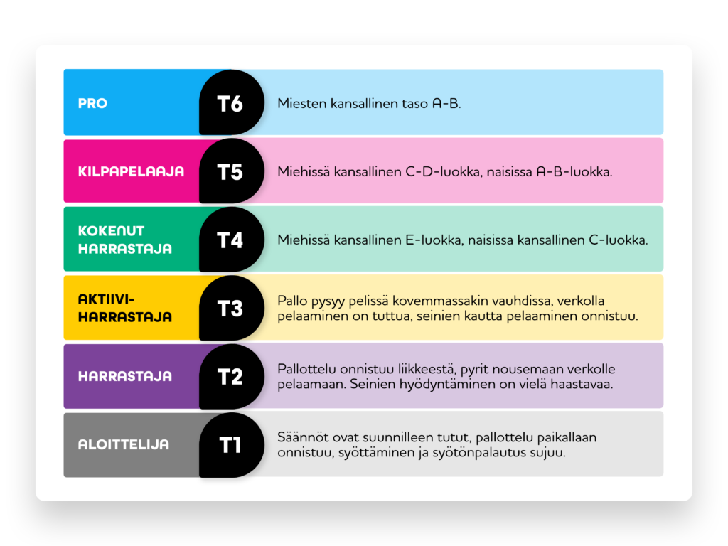 Ryhmästä voit löytää helposti samantasoisia pelikavereita. Tasot Vamoksella määritellään seuraavasti: