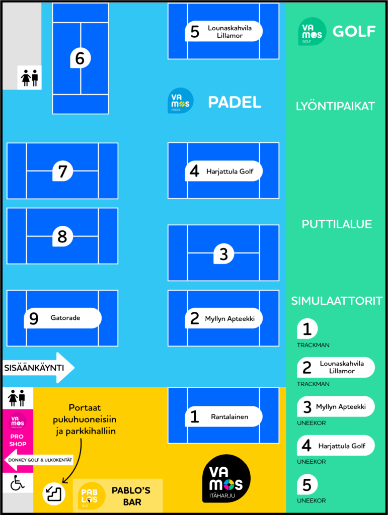 Vamos Itäharju tarjoaa ennennäkemättömät peli- ja harjoitteluolosuhteet golfin ja padelin harrastajille Turun Itäharjulla. Sporttinen Pablo’s Bar palvelee teitä ennen ja jälkeen pelien. Tiloistamme löytyy uusitut pukuhuoneet, sauna, kokoustilat ja lämmin parkkihalli.